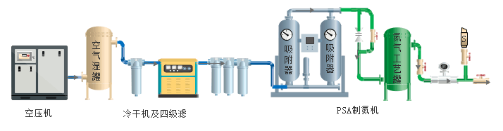 空壓機(jī)→空氣緩沖罐(濕罐)→C級過濾器→冷凍式干燥機(jī)→T級過濾器→A級過濾器→H級過濾器→制氮機(jī)主機(jī)→氮?dú)饬髁?,純度,壓力檢測→氮?dú)鈨?chǔ)氣罐→使用點(diǎn)
